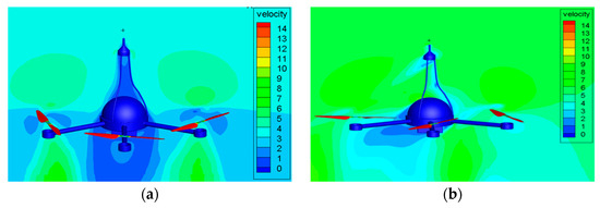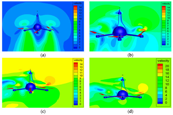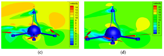 The measurement accuracy of the wind sensor on the top of the UAV will be affected by the airflow generated by the rotors. It is necessary to compare the simulation value and the standard value of the wind speed of the UAV under different ascent speeds and different crosswind conditions through CFD simulation. The wind speed measurement error of the UAV will be corrected by comparing the two values. In the paper, the UAV velocity flow field diagram is obtained through CFD simulation at different ascent speeds of 0 m/s, 3 m/s, and 5 m/s and different crosswind speeds of 0 m/s, 3 m/s, 5 m/s, 7 m/s, 10 m/s, 13 m/s, 15 m/s, 17 m/s, and 20 m/s. Figure 10, Figure 11 and Figure 12 are the velocity flow field diagrams of the UAV under different ascent speeds and crosswind speeds. The drone is hovering at the ascent speed of 0 m/s. When the crosswind speed is 0 m/s, the theoretical value of the wind speed measured by the UAV wind sensor should be 0 m/s. However, the flow field diagram shows a flow velocity exists at the wind sensor position, which indicates that the airflow driven by the rotation of the UAV rotors will affect the measurement results. When the UAV is rising at a constant speed, the UAV rotors have different effects on the flow velocity at the wind sensor position under different crosswind speeds.