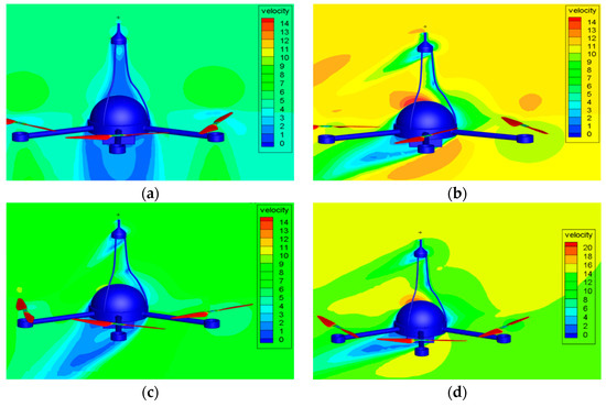 The UAV velocity flow field diagram at ascent speed of 0 m/s. when the crosswind speed is: (a) 0 m/s, (b) 5 m/s, (c) 10 m/s, (d) 13 m/s.