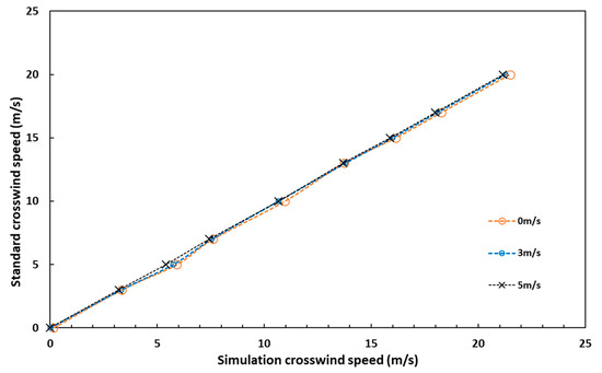 The wind speed measurement error of the airborne anemometer comes from the angle of attack of the UAV and the air turbulence of the rotors. Combining the two correction models can well correct the wind speed measurement error of the airborne anemometer. Figure 13 shows curves between simulation crosswind speed and standard crosswind speed under different ascent speeds based on the data in Table 1. It shows that the curves under the three ascent speeds are almost the same. In other words, although the airflow of the UAV rotors has an influence on the wind speed measurement, the speed of the rotor within 5 m/s is not related to it.