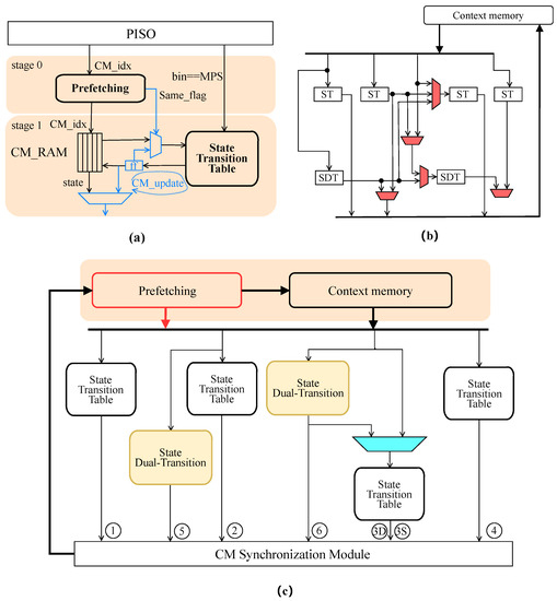 Figure 4a. Because only one bin is processed per cycle, the design of this paper uses Parallel In Serial Out (PISO) as the input module for context model update. The PISO module outputs data for one bin at each clock cycle. At the same time, the context model needs to be obtained from CM_RAM by index. Prefetching will save the relevant data and predict the next incoming bin to be the same context model as the current bin. Finally, the predicted bin values and other data are transferred to the next stage. Since RAM reading and writing consume one clock cycle, if consecutive bins utilize the same context model, the post-context model cannot access the data written after the pre-update of the adjacent clock cycle.