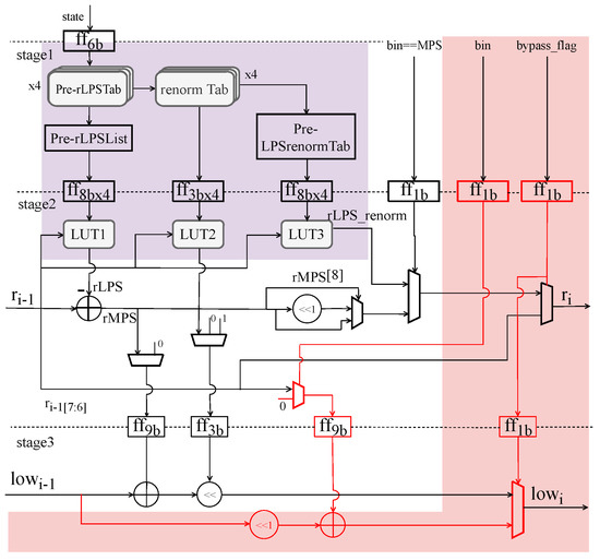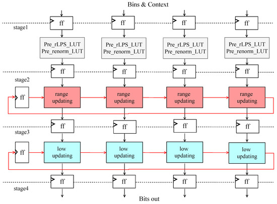 In the first stage of the pipeline, in addition to the pre-rLPScalculation and pre-renormalize, a pre-lookup table and storage structure for the renormalization count are added. The renormalization count candidates are stored in registers and will determine the final value in the second-stage pipeline, which will participate in the renormalization calculation of low. In a basic four-bin BAE, either a regular or a bypass bin must be encoded sequentially. As we can see through the previous section, the update phase of range in a single-path pipeline architecture becomes the critical path, while the update of low is more straightforward.