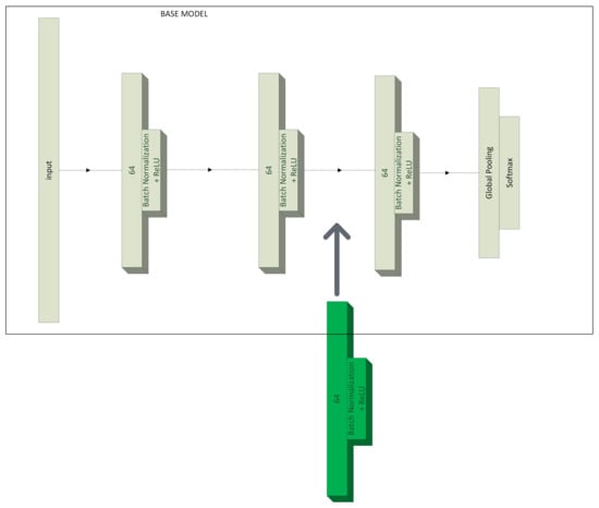 An alternative method of spectrogram processing and classification was also proposed; that is, the use of raw measurements from the sensor, without the use of signal processing methods such as Fourier transform, wavelet transform, or spectrogram generation. In the considered case, the so-called time series were analyzed []. For this purpose, the model structure proposed in [] was used, where a fully connected neural network acts as a feature extractor. This structure uses three basic convolutional blocks. Each of them consists of a successive convolution layer, a normalization layer, and an activation function, which in this case is ReLU. The convolution operation is implemented using three kernels of size {3,3,3} without striding, each of which also has 64 filters. The structure of the basic convolution block [] is expressed by the Equations (4)–(6).