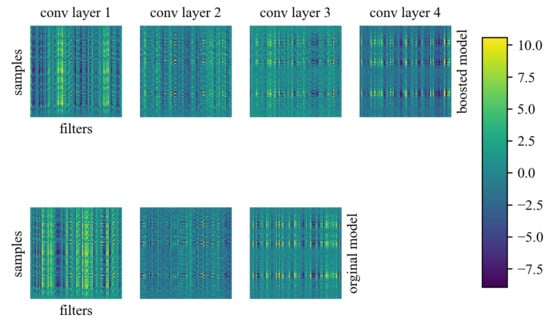Feature maps for the originally proposed model and boosted algorithm. Each map consists of 64 samples from 11,025 long vectors on the y-axis and 64 filters on the x-axis.
