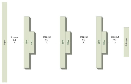 In order to compare with other popular neural algorithms, we attempted to train one more model. This was a classical multilayer perceptron (MLP) network with the structure proposed in []. It consisted of three hidden layers (8) containing 500 neurons, with each layer preceded by a dropout layer (7) with values of {0.1,0.2,0.2} and ending with a ReLU activation function (9). The last layer of the network was again softmax, this time preceded by a dropout layer with a value of 0.3. The entire network structure can be traced in Figure 3.