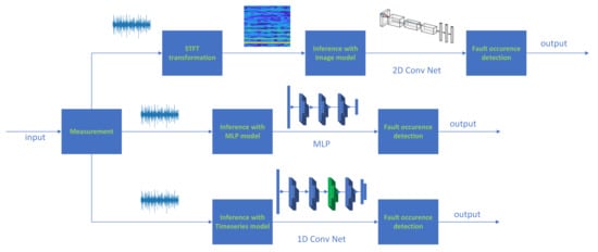Three methods were proposed to implement the detection algorithm based on deep learning. Two of them were based on time series data processing. The first was the proposed boosted 1D CNN algorithm, and the second was an MLP network. Both performed inference based on the data directly from the sensor, without using any signal processing methods. Another was a traditional method using an algorithm based on image processing, specifically signal spectrograms. The frameworks of all three algorithms are presented. In Figure 4, and we can see a data flow diagram for each algorithm.