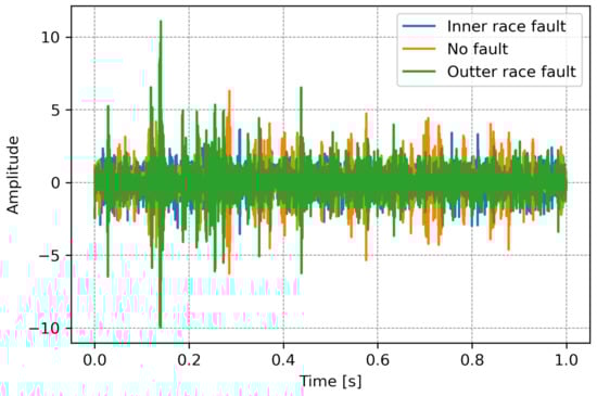 Predictive diagnostics for rotating equipment commonly rely on various data sources, including vibration [,], acoustics [,], vision systems [,], and thermal imaging [,]. Frequency domain or time–frequency domain analysis approaches, such as fast Fourier transform (FFT), continuous wavelet transform (CWT), and spectrograms obtained through short-time Fourier transform (STFT), are often used for vibration and acoustic analysis. These methods are more prevalent than time-domain analysis, as documented by the authors in []. Spectral or time domain data can be analyzed using either probabilistic or neural network approaches. In recent years, probabilistic approaches have become less popular, due to their poor robustness to new or unforeseen parameters, which can lead to false interpretations of the device’s state [,]. This is due to the fact that these methods necessitate comprehensive knowledge for developing a reliable system, and real systems are too complex to evaluate using such models. Despite the limitations of each approach, there is a need for a deeper analysis of neural methods.