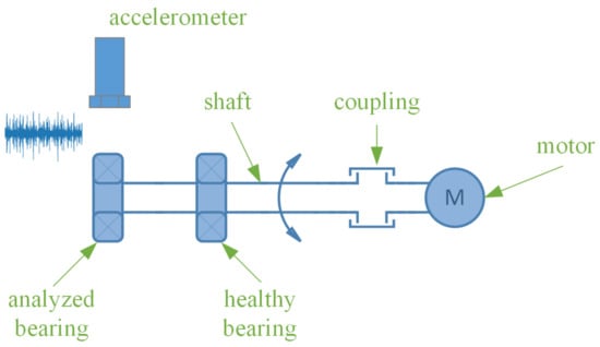 In order to collect the data necessary to learn the model, a test rig consisting of a bearing-mounted shaft driven by an electric motor was build. The shaft is coupled to the electric motor at one end and supported by two bearings at the other end. The accelerometer is mounted in the bearing housing, so that measurements can be taken for the bearing furthest away from the drive (Figure 9). It is mounted perpendicular to the shaft axis, making it possible to measure vibration accelerations in the perpendicular plane. In the case studied, the shaft did not carry any additional loads. The electric motor used was a servo-type drive. This was chosen because of its very high dynamics and following constant speed. A closed control loop and very low hysteresis allowed for precise setting and maintenance of the rotational speed.