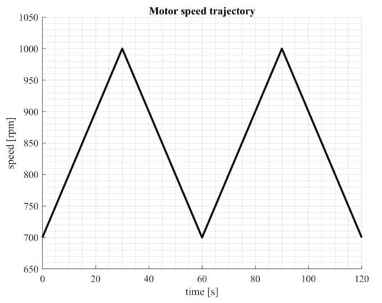 Using a PLC controller, a sequence was programmed in which the electric motor accelerated from 700 rpm to 1000 rpm in 30 s, and then decelerated from 1000 rpm to 700 rpm (Figure 10) in the same time interval. It was decided to analyze a variable range of speeds, rather than a constant speed, because this is more difficult to accomplish with standard expert-based methods. The frequencies calculated from the (1) and (2) equations are dependent on the shaft speed. Adopting a variable speed range also allows the algorithm to get closer to the operation of a real object and has tremendous implementation potential. In order to collect data for learning algorithms, a measurement of 20 min was performed for each bearing state. There is no specific set of rules to determine the size of a training dataset. However, it is said that for the classification problem, there should be at least 1000 data samples for each class when a designer tries to use a non-pretrained model.The measurement length was chosen based on this rule and heuristically. During the measurements, the programmed trajectory of the motor speed change was executed cyclically. Finally, about 60 min of vibration acceleration measurements were obtained.