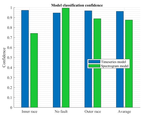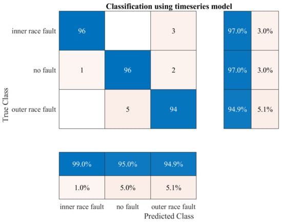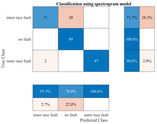 The trained and implemented models were tested on a laboratory bench. A script was created to record the algorithm inference results, classification confidence, and algorithm execution time. Such data allowed comparing the performance of the two models, not only in terms of accuracy of performance, but also inference time. Good performance was essential, because the algorithms ran on a low-power minicomputer, so the execution time significantly affected the performance of the entire detection system. However, the most critical indicator in failure detection is the precision of the detection algorithm. Confusion matrices were used to compare the performance of the algorithms. A confusion matrix is an N × N matrix used to evaluate a classification model’s performance, where N is the number of target classes. The matrix compares the actual target values with those predicted by the deep learning model. This gave us a holistic view of how well our classification model performed and what errors it made. In the case study, the model based on time series actions performed much better in the tests, because it achieved a 96.3% precision during the real-time tests (Figure 14). The second model based on image analysis performed worse in the tests, achieving an average precision of 90.6% (Figure 15). The most concerning factor was that the spectrogram model misclassified many inner race faults as a healthy bearing. This could cause a dangerous situation in a real detection system. The spectrogram model performed very well for the two classes of no fault and outer race fault, while for the third, the precision was significantly lower. It is possible that the precision of the model could be improved by expanding the learning dataset. A model based on image analysis is much more demanding to train and needs more data, despite being pretrained, which may have proved crucial in this case. In conclusion, the time series model performed much better during the tests.