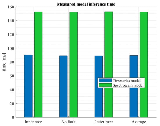 Figure 16 shows a comparison of classification confidence for both algorithms. The graph shows the average confidence value for each class. It can be seen that the time series model performed the classification with a significantly higher average confidence, around 95%, which is a satisfactory result. In contrast, interestingly, for the spectrogram-based model, the confidence was significantly lower, and the average confidence was 87%. It was close to 100% for the no fault class but significantly lower for the inner race fault class (74%). The execution time of both algorithms can also be compared (Figure 17). Here the time series based algorithm executed in an average time of 89 ms. The inference was much shorter than the image classifier model, where the average time was 153 ms. The time series model executed over 11 times in one second, while the spectrogram model executed over 6.5 times. This difference is significant. No large differences were observed between the classification times for each class.