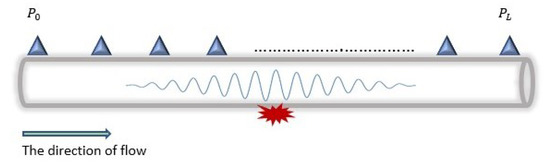 To elaborate on the PPA technique, we consider the placement of several sensors along the pipeline, as shown in Figure 4. The measured pressure of each sensor is relative to its position on the pipeline. With the Bernoulli equation, this can be determined using the inlet pressure , the energy head loss, the fluid velocity, and other parameters defined in Equation (2).
