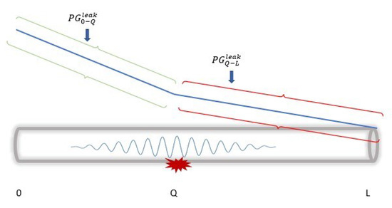 For instance, we consider a leakage occurrence at a point Q in the pipeline, assuming that denotes the pressure gradient between two points, a and point b, then and represent the two gradients before and after the leakage location. Note that represent the differences in the two steady states used in GM DAL with Equation (3).