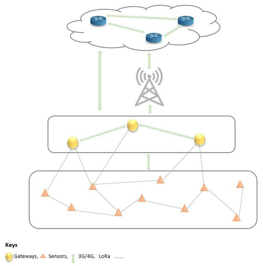 To increase reliability in the communication aspect of the work, we also propose the use of an available cellular network, such as 3G, 4G, or LTE as a backhaul. Figure 8 presents a typical communication system architecture. The end devices communicate with each other via the LoRa communication protocol. Other short- or long-range communication protocols between the sensors and gateways could be used at the time of deployment as needed. Devices at the fog and cloud levels also exchange information with the cellular network as the backhaul between the fog and cloud layers. Next, we present a sensor placement strategy to ensure event coverage in the system.