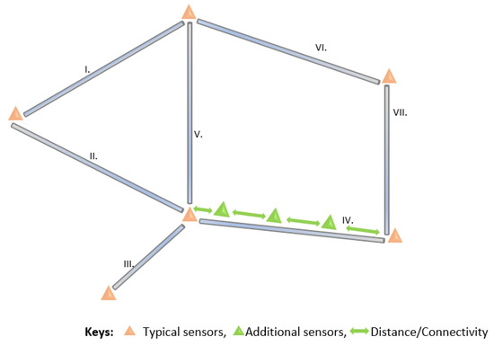 In Section 2, we presented various sensor placement strategies to improve different aspects of LDMSs, including transmission capacity, the shortest distance between the node and event, or placements at key junctions, as shown in Figure 9 [32,33,36]. The drawbacks of these approaches include increased energy consumption when the nodes are always transmitting at their maximum capacity. Moreover, because of the long distance in the transmission lines, such placements fail to detect small leakages. Moreover, failures in intermediate nodes or nodes in key junctions can lead to interruption in the DAL of the leakage.