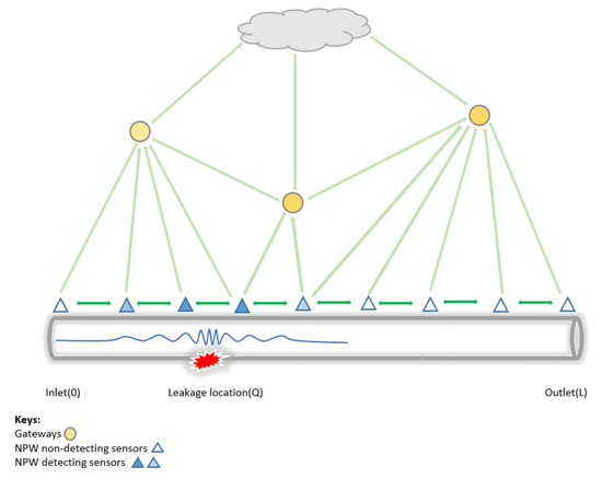 Hence, in recent years, industries have seen an increase in the adoption of WSN and IoT-based systems for infrastructure monitoring. The oil and gas industry covers three sectors (upstream, midstream, and downstream) to improve the various processes related to each sector. The midstream sector is used to monitor the various failures encountered in the transportation of oil and gas products. While research studies [2,10,11,12,13] have shown that it is more efficient compared to other LDMSs, some challenges still exist. For instance, energy consumption, reliability, the accuracy of leakage DAL, the sensitivity of detection communication and node failures, and single point of failure (SPOF) [14,15].