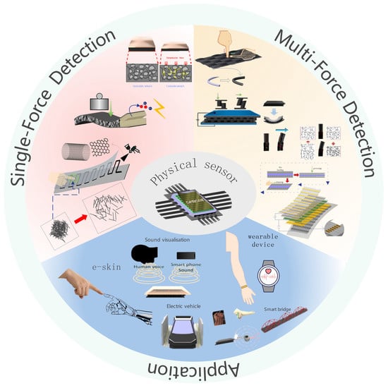 Figure 1 shows sensors that monitor and detect a single force [36,37,38,39,40] and multiforces [41,42,43,44], and illustrates their applications [45,46,47]. For application in many industries, these sensors require the sensing capabilities of multiforces and multiforce sensing and distinguishing them for accurately required force calculations. Most developed sensors can detect a single force, and sensors detecting multiforces have definite a limitation when many forces act on the sensor simultaneously. In particular, various physical quantity sensing and discriminating are important factors for many industries where various physical quantities are applied simultaneously. Therefore, sensing various physical forces has attracted growing interest, and many studies have been reported. Structures that enable sensing of various physical forces have been developed and combined with electrical layer for sensing performance. Sensors that sense only a single force show a very simple structure and easy fabrication process. However, for detecting various types of forces, structure and materials of sensors are complex and the fabrication process is very complex for embodying these sensors. In addition, fabricated sensors with highly complex structure and materials for multiforce sensing have an obvious limitation in the detection of multiforces simultaneously and cannot distinguish them perfectly. Electric signals from a sensor are the only signals that can perceive an external force and it is difficult to distinguish each external force. A multilayered sensor [48,49] was developed to overcome this limitation, and several trials for sensing various forces were conducted. Despite this, the mass production of sensors is limited by the many electrodes required for sensing and the complicated fabrication process [50,51,52,53]. This review explains and summarizes the development of a sensor that can detect a single force and multiforce and its applications. The sensing mechanisms of sensors for various forces and their structure for sensing performance are also explained.