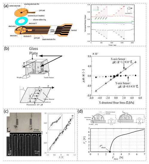 The detection of shear forces has always been an important issue. There is a need for thin, wearable shear sensors in rehabilitation engineering, e.g., shear force detection between a prosthetic wearer and a prosthesis [69] or the measurement of a shear force between the sensor and the fluid interface in contact [70]. A shear force feedback system is used in optical microscopy [71]. There are generally two methods for accurate shear detection: piezoresistive and capacitive. Other forces, such as normal forces, should be avoided in detecting shear. A sheet shear force capacitive pressure sensor and its measurement system were developed (Shigeru Toyama et al. [69]). When a shear force is applied to the sensor surface, the electrode-patterned films move towards each other, causing the distance between the electrodes inside the sensor to change, resulting in a change in the capacitance of the sensor. The sensor also exhibits insensitivity to temperature changes. Figure 3a shows the structure of the sensor and the change in capacitance of the four capacitors when shear forces in different directions are applied. An upright piezoresistive cantilever with an embedded elastic material is proposed to detect a shear force applied to a surface, as shown in Figure 3b on the left side of the sensor operating principle and the right side of the graph corresponding to the change in shear force versus resistance (Kentaro Noda et al. [72]). A bionic, thin, and flexible liquid-metal-filled resistive PDMS microchannel shear-sensing skin was developed by observing the phenomenon of compression on one side and stretching on the other when a human finger was subjected to a shear force (Jianzhu Yin et al. [73]). Figure 3c shows the construction of the sensor, and the graph shows a linear relationship between the sensor response and the applied shear force for a constant normal force of 1 N. A piezoresistive shear detection sensor was also produced, where the distance between the two conductive sensor components depends on the shear force acting and the internal pressure (A. Chaykina et al. [74]). The magnitude and direction of the shear force are determined electrically by measuring the internal pressure at opening or closing. The structure of the sensor and the relationship between the shear force and the corresponding voltage are shown in Figure 3d.