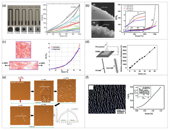 (a) e−3DP−printed images of the top and cross-section of a soft sensor at different speeds, and images of the change in deformation rate vs. resistance value at different speeds. Reproduced with permission from Advanced Materials (2014) [76]. (b) The 2.3 wt.% and 10 wt.% CNT loading and relative resistance of CNTs−TPU fibers with various contents of CNTs under stretching at a displacement rate of 5 mm/min (sample length is 20 mm); the inset shows a magnified image of the relative resistance change in the strain range from 0% to 750%. Reproduced with permission from Carbon (2012) [77]. (c) Sensor principles and the response of AgNWs−PDMS nanocomposites applied strain through experimental measurements and numerical simulations. Reproduced with permission from ACS (2014) [78]. (d) Schematic diagram of the fabrication of a hybrid structure of ZnO NWs/PSNFs and the relative change in resistance of the sensor at different strains. Reproduced with permission from Advanced Materials (2011) [79]. (e) Numerical simulation results based on molecular dynamics of Ag NP films during elongation/relaxation and the relative change in resistance of Ag NP films with and without initial microcracking during stretching/release, as calculated by a numerical simulation. Reproduced with permission from Nanoscale (2014) [80]. (f) SEM image of the 10 layers of CNTs films and relationship between the strain pressure and resistance change after the composition of the sensor. Reproduced with permission from Journal of Materials Chemistry C 2018 [81].