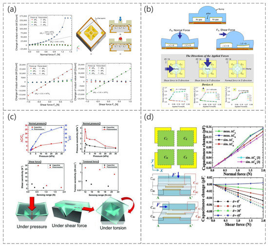 (a) Electrode layout; working principles for normal force FZ and X-axis shear force FX, change in the output value of the three-axis integrated tactile sensor by normal force FZ; shear force FX and shear force FY. Reproduced with permission from Sensors (2017) [117]. (b) Schematic diagram of a shear stress sensing element without applied forces, with a normal force, a shear force, and measurement of capacitance in relation to an applied force (N). Reproduced with permission from Sensors (2010) [118]. (c) Capacitance/resistance curve for different mechanical stimuli and schematic diagram of sensor operation. Reproduced with permission from Adv Mater Technol (2019) [119]. (d) Structure and operating principle of the sensor, the capacitance change curve when subjected to pressure, and the simulated response pattern of a shear force at different plane shear angles. Reproduced with permission from Sens Actuators A (2017) [120].