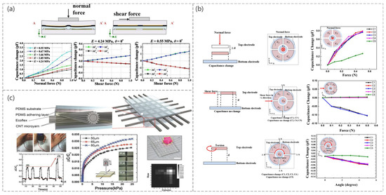 An increase in sensor sensitivity is achieved by reducing the stiffness of the material and structure, as shown in Figure 8a, specifically by reducing the Young’s modulus of the elastomer separating the two electrodes of the capacitor to make it more susceptible to deformation, and the experimental results showed that the sensitivity of the sensor to normal and shear forces increases as expected, while the shear angle detection capability remains unchanged (Yu-Hong Gao et al. [121]). The maximum sensitivity enhancement compared to a typical CTS is 217.6% and 661.3% for normal and shear forces, respectively. The proposed capacitive pressure sensor consists of five electrode cells and was shown to solve the coupling problem within the normal force and shear force by the unique design of the electrode shape (Min-Sheng Suen et al. [122]). Figure 8b shows the specific structure, sensing mechanism, and capacitance variation curve when applying normal, shear, and torsional forces to the sensor. For the first time, using hierarchically engineered elastic carbon nanotube (CNT) fabrics, this sensor can detect pressure and flexion sensing capabilities as well as temperature and humidity. Therefore, it has great potential for e-skin applications (So Young Kim et al. [123]). The sensor is a capacitive pressure sensor consisting of CNT microyarns and Ecoflex dielectric, with PDMS used as an adhesion layer to inhibit the delamination or peeling of the CNT microyarns from the PDMS substrate, as shown in Figure 8c.