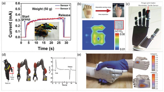 The skin is the largest organ in the body and can simultaneously sense many stimuli, one of which is pressure [129,130]. Electronic skin has ushered in new developments of technology through pressure sensors to enable robots to have the same sensory capabilities as humans [131,132]. Inspired by the fingertip skin, a highly sensitive pressure sensor with a layered structure of conductive graphite/polydimethylsiloxane foam can be used for electronic skin, and the sensor can sense pressure, texture roughness, and temperature, as shown in Figure 9a (Qi-Jun Sun et al. [133]). The sensor is mounted on a robotic arm, and, depending on the current response obtained from different grasping weights, the robotic arm can obtain “haptics”. Also inspired by human skin, a skin-inspired highly stretchable and conformable matrix network (SCMN) was presented (Qilin Hua et al. [134]). As shown in Figure 9b, experiments have shown that this sensor can be used to identify the location of the pressure load, and the sensor can measure a variety of stimuli in addition to pressure only. A high-sensitivity capacitive pressure sensor was developed with a fingerprint-like pattern embedded in a 3D printed robot arm with a capacitive-piezoelectric tandem sensing structure, and it can detect and discriminate between spatiotemporal tactile stimuli, including static and dynamic pressures and textures (William Navaraj et al. [135]). The sensor can detect and differentiate spatiotemporal tactile stimuli, including static and dynamic pressure and texture, and simulate the real tactile sensation of human hands, shown in Figure 9c. The robotic arm is made “tactile” using an inexpensive randomly structured polystyrene (PS) as the base polymer and using electrostatic spinning to produce a functional fiber pressure sensor (Tamil Selvan Ramadoss et al. [136]). The sensor recognizes the applied pressure using the open-circuit voltage, as shown in Figure 9d, which is mounted on a robot arm and varies over time as the weight is grasped and released. In addition to the commonly used capacitive e-skin, a triboelectric nanogenerator (TENG) with self-powered mechanism was fabricated by easily replicating the surface morphology of natural plants and making interlocking microstructures on the friction layer, as shown in Figure 9e (Guo Yao et al. [137]). The previously mentioned sensors of [96,98,99,123,127] similarly elaborated the applications in electronic skin.