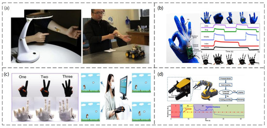 (a) HMI for wireless light switches and HMI for wireless vehicle controllers. Reproduced with permission from Nano Energy (2020) [141]. (b) Optical image of the entire wearable stretchable glove connected to the five ISPs and the processing circuit. Images of hand gestures and their corresponding machine hand gestures, the output digital signal of the processing circuit with different gestures. Reproduced with permission from Nano Energy (2022) [142]. (c) Imitated gestures and the smart glove used in intelligent rehabilitation training by playing PC games. Reproduced with permission from Chemical Engineering Journal (2021) [143]. (d) An application demonstration of the strain sensor in a robotic hand system. Reproduced with permission from Sensors and Actuators A: Physical (2018) [144].