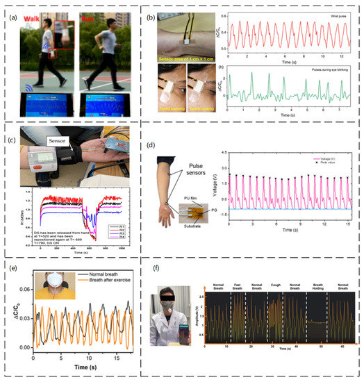 (a) Image of wireless health monitoring system applied while walking and running. Reproduced with permission from Nano Energy (2019) [154]. (b) Real-time monitoring of the capacitive response of the wrist pulse sensor and the photographic corresponding blinking action of a sensor used to detect muscle movements during eyelid opening and closing. Reproduced with permission from ACS (2019) [155]. (c) Measurement setup (DC−2) for evaluating the FPS. The sensor is placed on a radial artery, covered by a Velcro band, and placed immediately next to it is the digital sphygmomanometer; graphical representation of the measuring setup (DC−2) for an evaluation of the FPS. Reproduced with permission from Sensors (2021) [156]. (d) Sensor placement and corresponding curves. Reproduced with permission from Sensors (2021) [158]. (e) Respiration monitoring under pre-and post-exercise conditions. Reproduced with permission from ACS (2020) [159]. (f) Photograph illustrating the wireless breath-monitoring process. Photographs showing the measured continuous and successive breath conditions of normal breath, fast breath, normal breath, cough, normal breath, breath holding, and normal breath of the tester. Reproduced with permission from Advanced Materials (2022) [160].