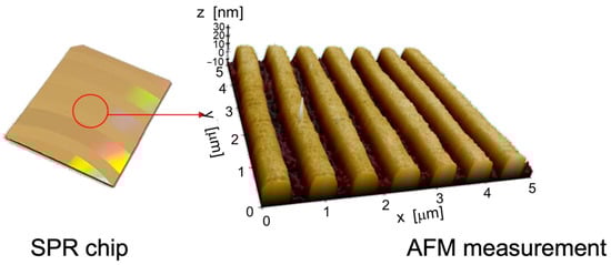 The vertical SPECTRA configuration allows to characterize surfaces at a low resonance angle. In order to assess the proposed device influence on SPR measurements, we carried out experimental tests using custom-made gold grating sensors. The grating sensors were fabricated by sputtering 50 nm gold over a nanostructured polycarbonate substrate having a 720 nm period, as shown in Figure 2. Their production was based on polycarbonate of optical disks, which were customized to have a continuous grating with specific period covered by a gold layer, which ensures great affinity with biomolecules.