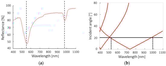 (a) Air reflectance of 720 nm period gold gratings; (b) Vectorial model of the plasmonic peaks as a function of incident light angle (θi) and wavelength. The black dashed lines show the wavelength of the peaks.