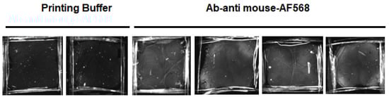 The sensor surface functionalized with the anti-mouse-AF568 antibody or without antibody (printing buffer). In the presence of antibody after the excess removal, it is possible to observe a fluorescence signal caused by the immobilization of the fluorescent probe on sensor surface.