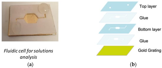 The horizontal SPECTRA configuration results are more suitable for SPR measurements in solution due to the planar structure. Hence, we carried out experimental tests in order to demonstrate the device’s operation in the presence of aqueous solutions. The measurements were performed using a custom-made microfluidic cell (Figure 6) integrating the 720 nm gold gratings. The microfluidic cell was made of two polycarbonate layers (thickness 0.6 mm). The bottom layer was cut to obtain the fluidic channels and the cell, while two holes were cut on the top layer edges to allow the fluid injection. The final polycarbonate structure was glued to the grating. A system of tubes, syringe, and a peristaltic pump (VELP SCIENTIFICA SP311) was connected to the microfluidic cell through the holes.