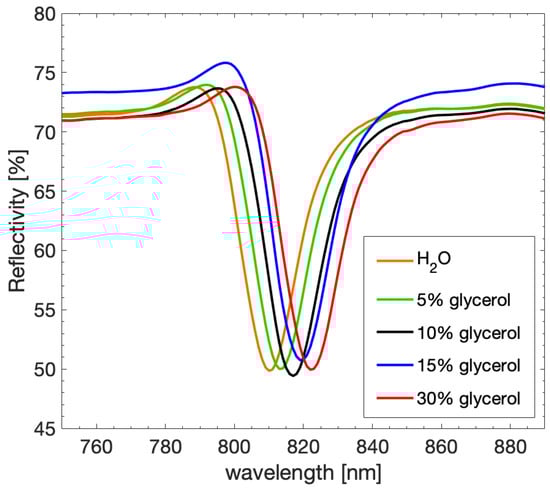 Reflectivity as a function of wavelength for aqueous solutions at increasing glycerol concentration with a grating period of 720 nm.