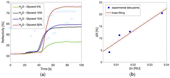 The same experiment was performed for four increasing glycerol concentrations (5%, 10%, 15%, 30%). For all the samples, the reflectivity spiked rapidly, reaching the maximum value around 60 s and remaining constant overall until the end of the observation time. The reflectivity values, the respective variation of reflectivity ∆R, and the variation of reflective index between water and glycerol solutions are calculated and reported in Table 2. As expected, all the samples show an increase in ∆R and ∆n proportional to the glycerol concentrations. The correlation between ∆R and ∆n can be seen in Figure 8b, evidencing a linear behavior. Hence, the system sensitivity can be estimated from the linear pendency, and it is calculated as 470.5%/RIU.
