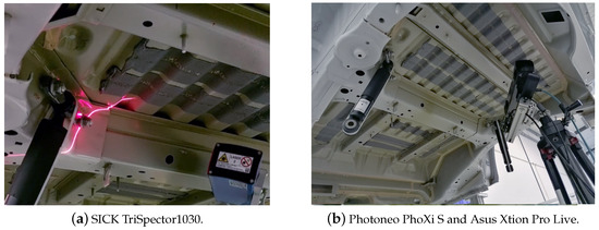 The structured light sensors were mounted on a tripod since they need to be static during the scanning procedure. The same does not apply to the laser line triangulation sensor, which was installed on the end effector of a robotic arm (Doosan H2017) to capture the 3D profiles of the region of interest (ROI). Figure 3 shows the location of the sensors with respect to the van undercarriage.
