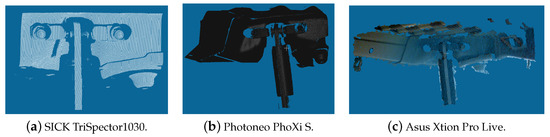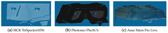 With this use case in mind, three sensors based on active depth sensing technologies were chosen, namely, the SICK TriSpector1030 (laser line triangulation), the Photoneo PhoXi S (visible stripe pattern structured light) and the Asus Xtion Pro Live (IR speckle pattern structured light). They are presented in Figure 1, and their technical specifications are presented in Table 1.