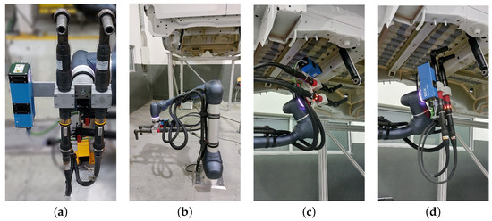 Testing environment for the automated axle damper fastening platform. (a) Robot tool with the 3D sensor (blue) and the two screwdrivers. (b) Robot with base centered with the left and right axle dampers. (c) Robot and tool positioned to scan the ROI. (d) Robot and tool positioned to perform the tightening operation.