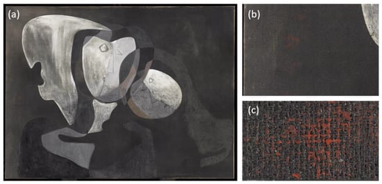 Salvador Dalí’s Two Figures (1926) was affected by the transfer of a reddish pigment when another painting came into contact with this work. Figure 1b,c show the detail of the reddish pigment, obtained from a gigapixel image taken by the restoration team of the Museo Nacional Centro de Arte Reina Sofía (Figure 1a).