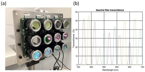 (a): Front of Hypermatrixcam; (b): transmittance curves for the spectral filters, ordered from left to right as 470, 490, 510, 530, 550, 570, 590, 610, 630, 650, 670, and 690 nm.