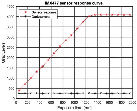 To define the linearity limits in the response of the CMOS sensors, the curve of the sensors as a function of exposure time was obtained (Figure 4). For these measurements, white LED illumination was used, without the superimposition of spectral filters on the sensors, since the distortion between the response curves of the sensors for the different wavelengths is minimal in the visible spectrum [].