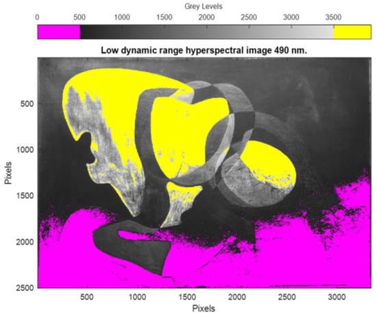 LDR multispectral image of Two Figures (1926) at 490 nm, with underexposed (yellow) and overexposed (pink) pixels.