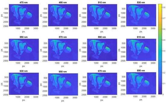 Multispectral images (MSI) were acquired with different exposure times to give HDR images of Dalí’s painting Two Figures (1926). From these images, and using Equation (1), the HDR spectral reflectance was processed, as shown in Figure 6. The spectral resolution of the measurements was 470–690 nm in steps of 20 nm, and the spatial resolution was 3322 × 2510 px.
