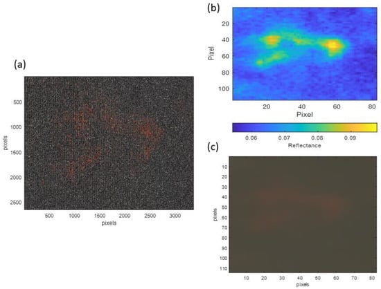 To segment the pigment, it was first necessary to characterise it colorimetrically. For this purpose, a small area of the paint affected by the transfer of the reddish pigment (Reference Area 1) was selected, with a size of 6.8 × 4.9 cm. Figure 7a shows a high-spatial-resolution gigapixel RGB image corresponding to Reference Area 1, while Figure 7b shows the HDR spectral reflectance value for the same area at a wavelength of 630 nm, where the reddish pigment is detected as an area of pixels with higher reflectance (shown in yellow on the false colour map). Figure 7c shows the RGB image obtained from the HDR spectral reflectance measurements.