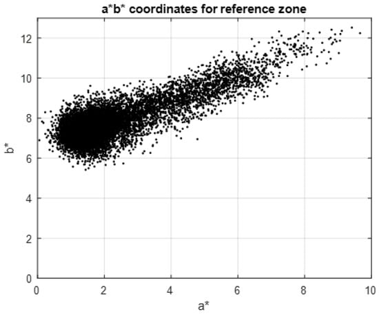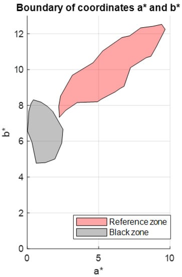 In the same way as described in the previous section, the coordinates  for Reference Area 2 were obtained using illuminant A and a standard CIE 1931 observer at 2° as the reference illuminant. The region bounding the  values was then obtained and plotted next to the region of  values (Figure 14).