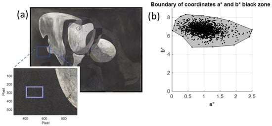 In this case, a black area was selected (Figure 9a), and its components  were calculated. The components  formed a point cloud, which was plotted next to the boundary of the  values; this boundary allowed us to segment the rest of the  values present in the painting (Figure 9b).