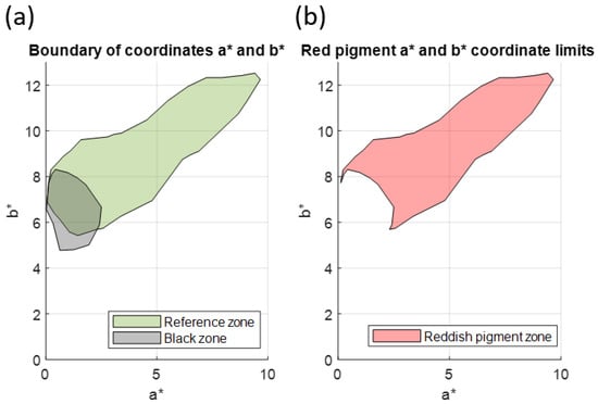Once the region with the values  had been defined, it was represented next to the envelope bounding the values  of Reference Area 1, which was selected to characterise the red pigment (Figure 10a). The geometric difference between the two regions was then found in order to define the region with the  values corresponding to the reddish pigment (Figure 10b).