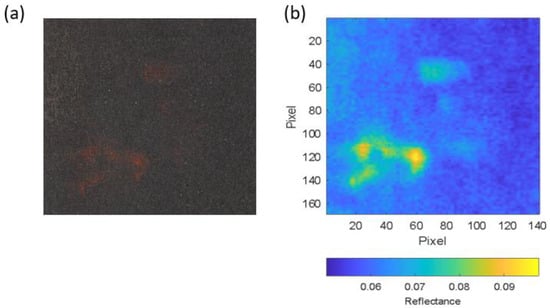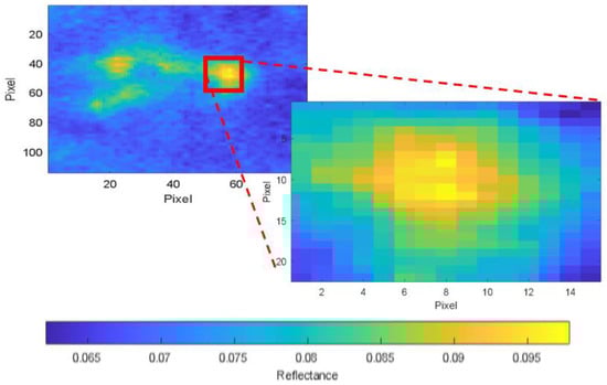 To validate this method, we selected an area (called the segmentation area) that was larger than the one selected as a reference for the analysis. Figure 11a shows the segmentation area in an RGB image, and Figure 11b shows the segmentation area in a false colour image, in which the reflectance at 630 nm is represented.