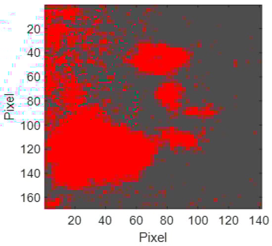 Using the  values obtained above, the reddish pigment present in the segmentation area was segmented (Figure 12).