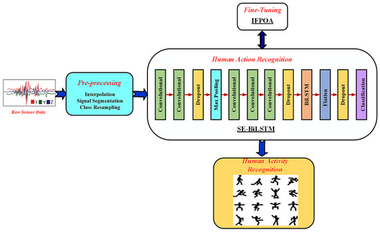 To recognize human activity, a hybrid Deep SE-BiLSTM model is presented. The signal pre-processing is conducted using a linear interpolation algorithm, sliding window segmentation, and class resampling. The high-level discriminative features that describe an activity’s characteristics are found using SqueezeNet, reducing the effects of outliers and irrelevant sensor data. The BiLSTM uses the features’ gating mechanisms to encode the bidirectional long-range dependencies. The BiLSTM effectively resolves the vanishing gradient and information loss issues. The optimal hyperparameter values are empirically determined by conducting the batch size, BiLSTM merge mode, and hyperparameter tuning on an optimizer. The loss function is reduced by updating the parameters of the network in the training phase. The network’s hyperparameters are updated using an IFPOA optimization algorithm. Three HAR datasets, including an MHEALTH dataset, the KU-HAR dataset, and the PAMPA2 dataset, are tested to compare the performance of the proposed SE-BiLSTM with the existing approaches. The architecture of the proposed methodology is given in Figure 1.