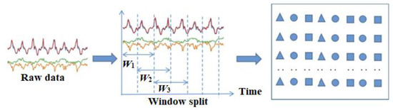The sensor data are primarily divided into fixed-size windows using the sliding window approach. For each selected dataset, the proposed model uses a sliding window of size 128 and 50% overlap. The data size for each window of readings is 6 MB, containing nine feature data points. Frames of size (128, N) are used to segment the data, where the numbers of features or frames are represented by N. Figure 2 illustrates the process of data pre-processing.