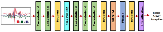 Based on device interactions for predicting human activities, HAR is a challenging task. It helps people in various ways in their daily lives [1,2]. Two techniques are used to recognize human behavior: video image recognition and wearable sensors [3,4]. To identify human activities, the camera is utilized by video systems [5]. This approach demands the deployment of expensive cameras and networks, and causes problems due to the scale circumstance, lighting, and background that make detection challenging [6,7]. The next method relies on wearable sensors to identify human movement, specifically gyroscopes, magnetometers, accelerometers, linear acceleration, and other devices that translate human actions into identifiable signals [8,9]. With fewer environmental restrictions, a new dimension is added to moving by the sensor-based method compared to a video-based method, and also gives the user privacy [10,11].